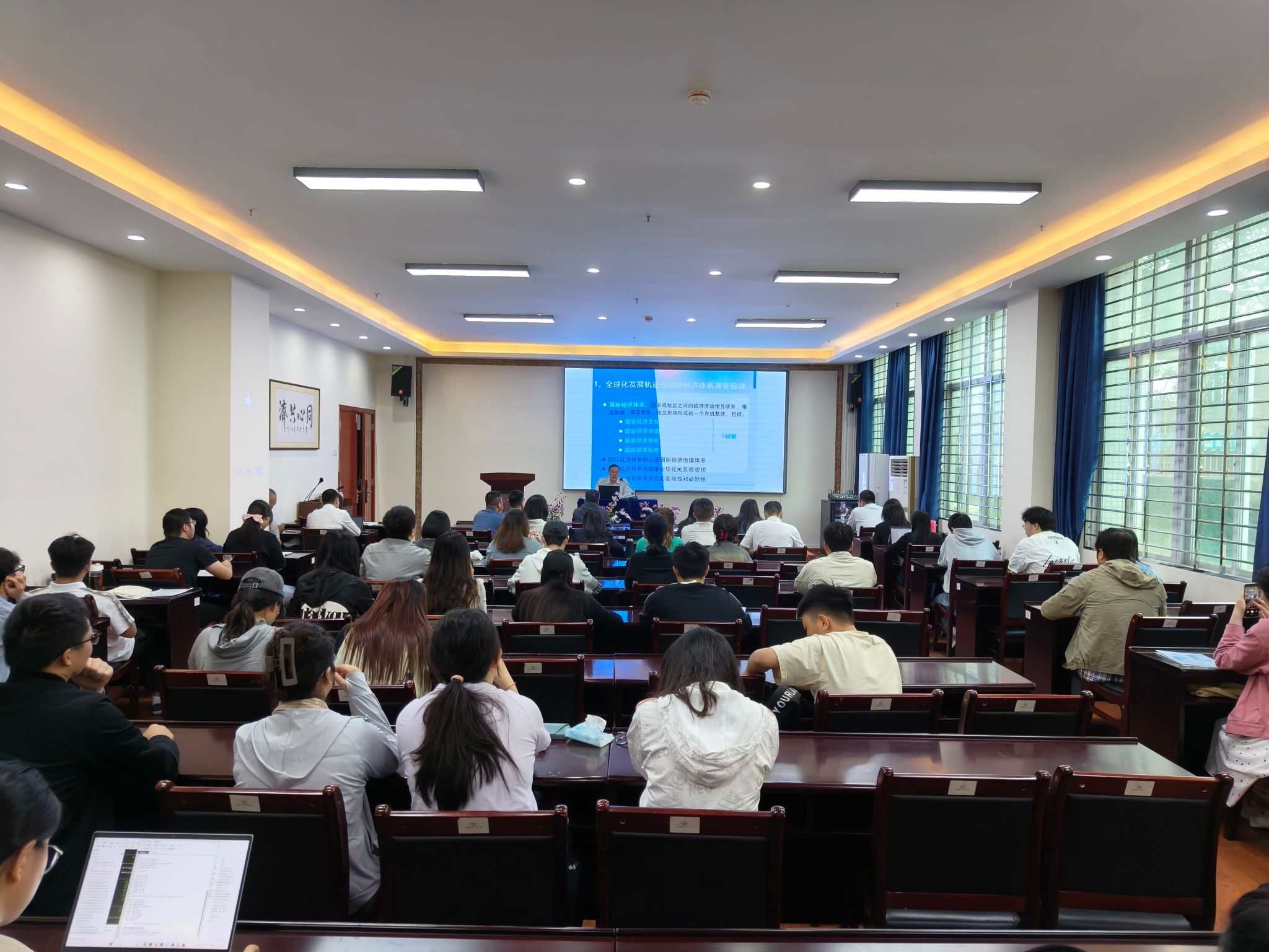座谈会后,钱克明同志在社科楼B112学术报告厅为学院师生作题为《国际经济体系面临的新形势与中国的应对》的学术报告。围绕全球化发展轨迹与国际经济体系演变规律和国际经济体系的新形势与中国的战略选择,他为学院带来了一场思想盛宴,并与师生进行了深入交流。