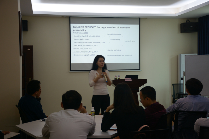 周教授通过案例分享的方式,主要围绕收入对亲社会行为的影响展开,并以丰富的专业知识分享其新近开展的几项研究,与大家进行了充分的互动。尝试从三个研究领域转变观点:mean to variance;economic inequality to economic mobility;temporal distance to physical distance。不仅开阔了视野,还丰富了大家对研究的思维方式。最后,周教授还分享了她认为科研需要的三个能力,分别是影响升级、化繁为简和联机写作。