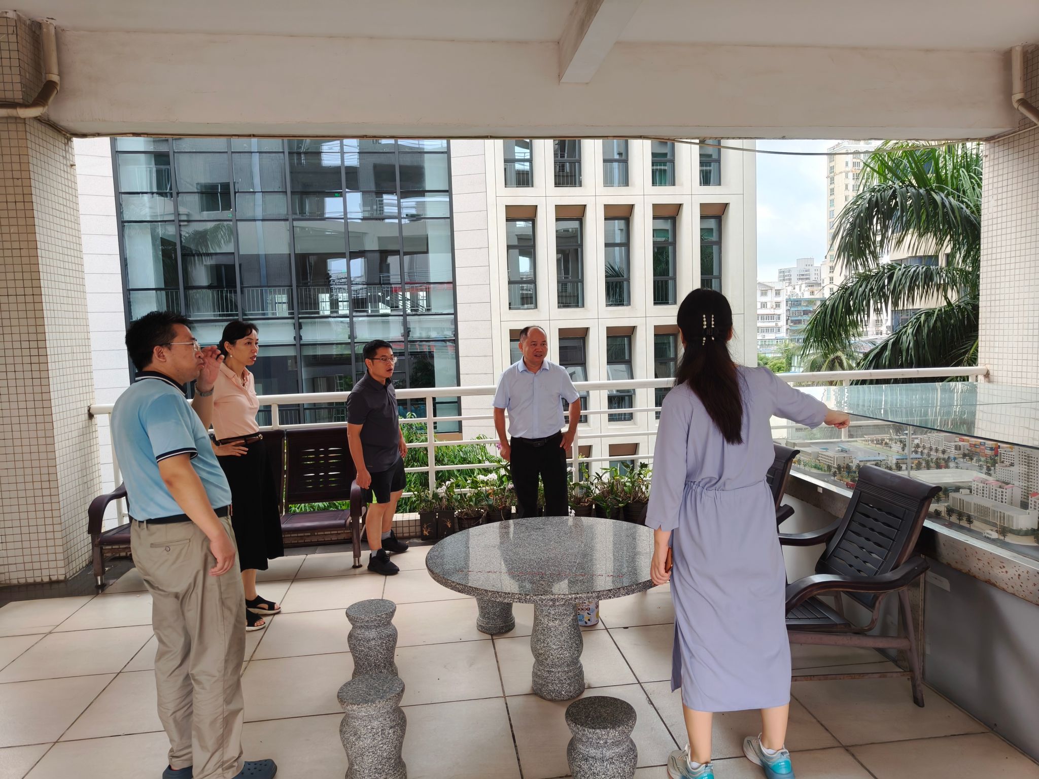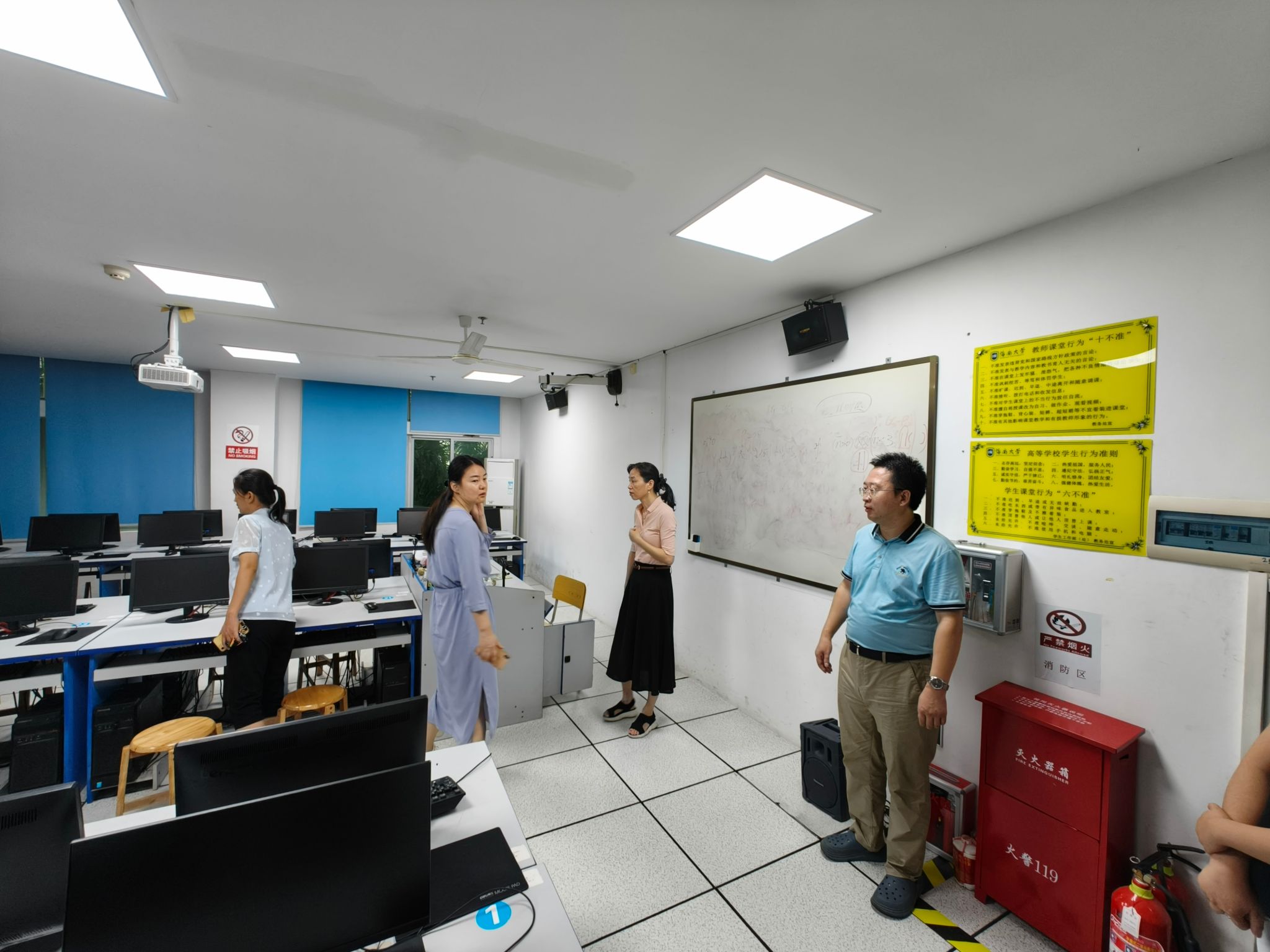为确保台风期间师生生命财产安全和校园稳定,院长唐宁玉带队全面排查学院防风设施、内涝点等重点部位风险隐患。2024年9月5日上午8:40,在唐宁玉的带领下,安全风险防控小组全面开展对各办公室、实验室、楼顶等部位的排查,重点检查实验室的用电安全、门窗有无破损,强调加固玻璃窗、清理高空坠物。同时,防控小组召开协调会议,社科楼楼宇各单位负责安全的老师参加会议,对防风防汛相关工作做了部署。
