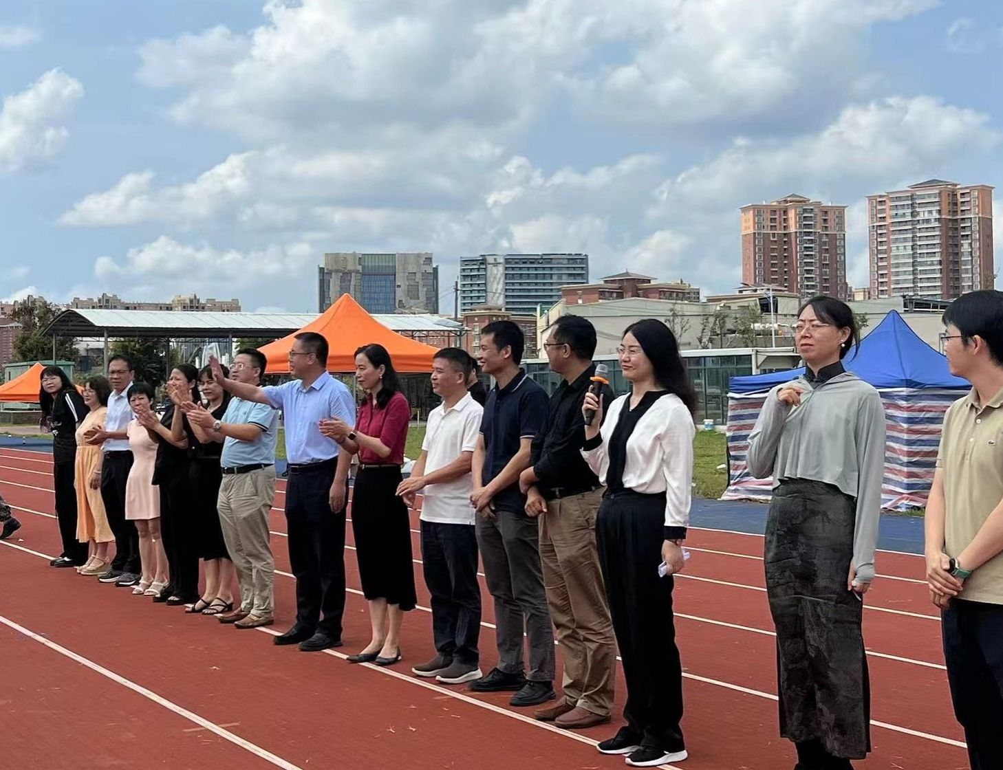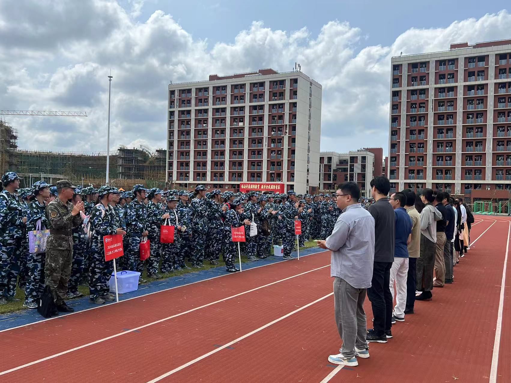 会后,学院班子成员们走进训练场深入军训队伍中,与军训新生们亲切交流并发放慰问物资。