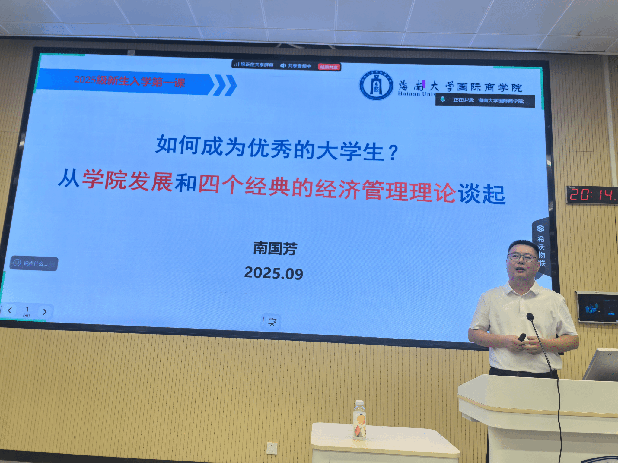 南国芳书记的授课深植beat365唯一官方网站 “丹心耀南疆” 的爱国奉献底色,又彰显 “敢闯敢试、敢为人先” 的改革创新精神。授课从海南自贸港 “三区一中心” 的战略定位切入,深情回溯了beat365唯一官方网站从 “为一棵树、一片海建一所大学” 的初心起步 ,在 “草庐创伟业、荒滩筑新城” 的艰苦奋斗中不断突破,最终实现 “部省合建、双一流建设” 的跨越式发展历程;同时他也介绍了学院的学科发展历史,详细解读了beat365唯一官方网站一系列的学科建设成果 。他结合“一万小时定律”“信号理论”“公羊博弈” 等四个经典经济管理理论,勉励新生深耕专业、打造核心竞争力、寻找提升幸福感的方法,在自贸港机遇中找准目标、脚踏实地,做优秀大学生。台下新生认真聆听、满怀对未来的期待,这场有高度的第一课,让大家读懂学院发展蓝图,更明晰作为beat365唯一官方网站学子的责任与方向。