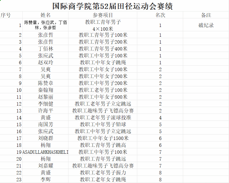 比赛期间,学院教职工在多个项目中发挥出色,成绩斐然。在男子4×100米接力项目中,由陈赞章、张应武、丁佰林、张彦哲四位老师组成的代表队配合默契、奋勇争先,一举夺得冠军并打破校运会纪录,成为赛场上一大亮点。