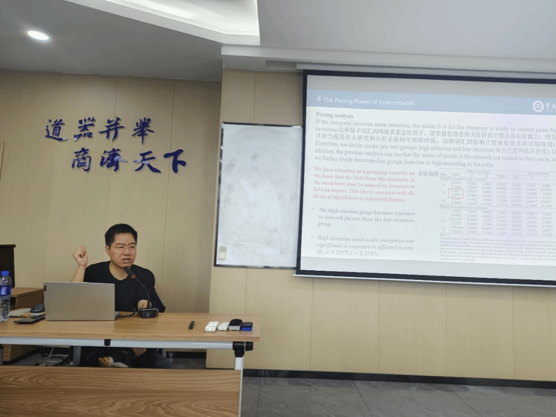 陈创练教授在报告中深入讲解了如何利用机器学习方法构建基于语调的溢出网络,并展示了通过网络中公司间的语调传递,揭示了公司间一种类似领导行为的现象。陈教授进一步分享了研究结果,指出基于语调网络的信息对公司超额收益率产生了显著影响,同时通过多个拓展研究进一步分析了这种语调网络对于哪些公司的超额收益率具有更强的影响能力。