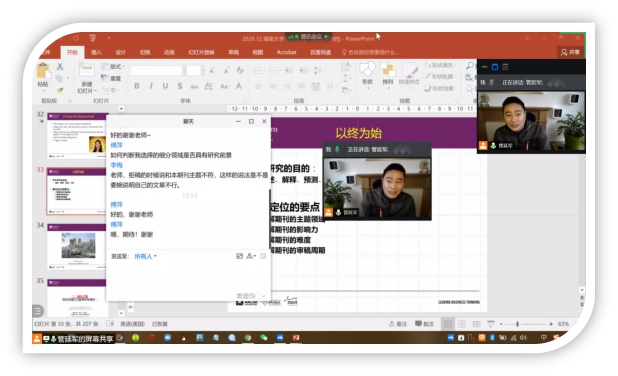 “个人研究设计分享”环节,解智宇同学向大家分享了自己的研究设计,学员们针对他的报告积极提出疑问并给出了建设性的建议,管教授针对汇报和点评给出具体详实的指导和建议。通过此次分享,解智宇同学获得了许多宝贵的建议来帮助他完善研究设计,参与课程的其他学员也在课程的全面卷入中收获了满满的干货。
