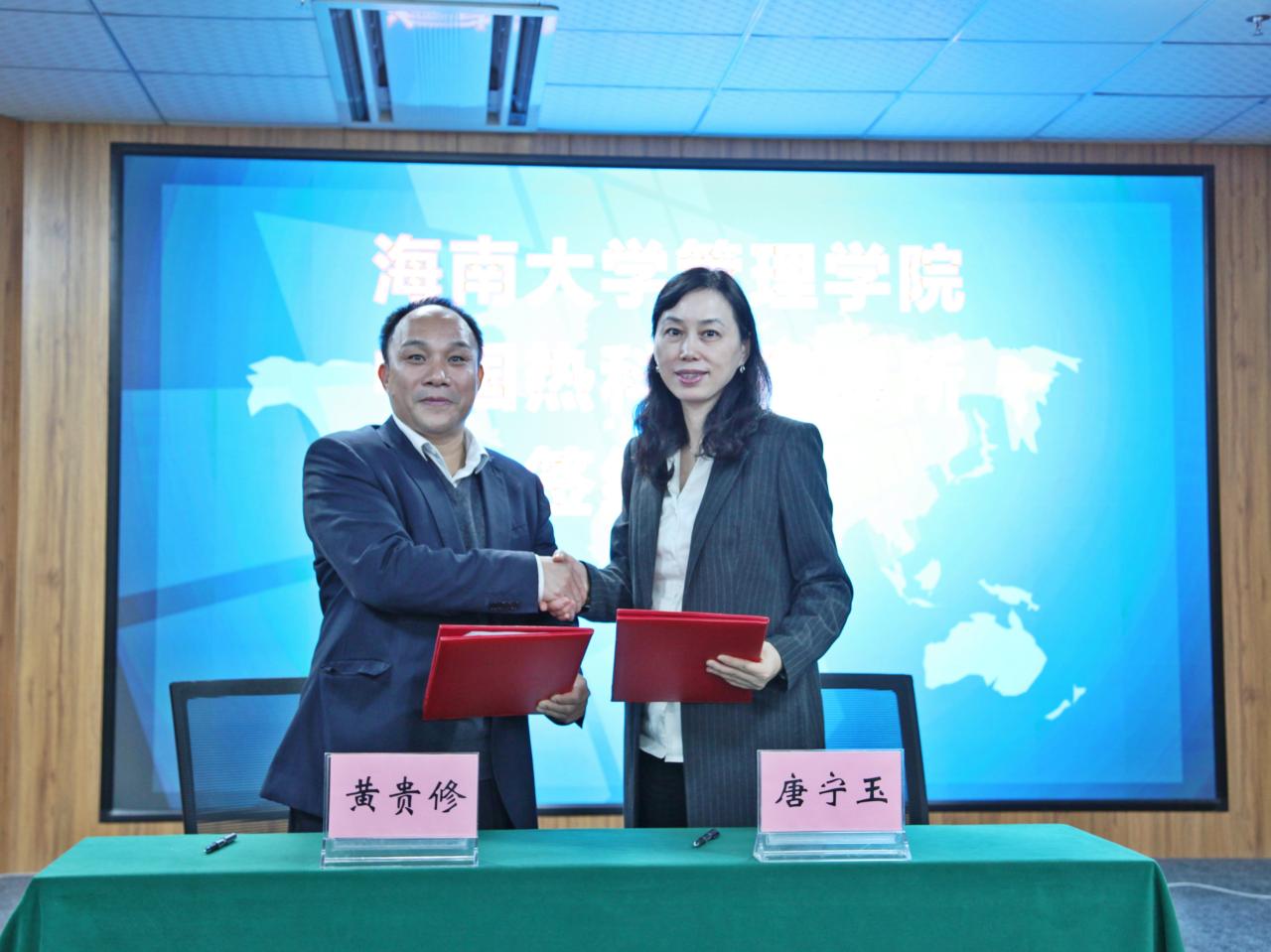 之后,双方就学生培养、平台建设、热带农业发展、未来规划等方面内容展开了亲切交流与深入讨论。唐宁玉院长与黄贵修所长正式签署合作框架协议,在今后,双方将本着“优势互补、双方互动、合作共赢、共谋发展”的原则,充分发挥彼此优势,通过整合各方资源,采取联合培养研究生、平台(基地)共享共建、共同组建科研团队,联合申报科研项目,组织开展学术交流等措施加快提升科学研究水平和人才培养质量,协同推进热带农林经济管理学科发展,为热带农业发展和海南自贸港建设提供强有力的科技和人才支撑。