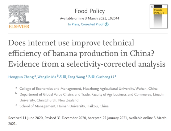 Zheng, Hongyun, Ma, Wanglin, Wang, Fang, and Li, Gucheng. (2021). Does internet use improve technical efficiency of banana production in China? Evidence from a selectivity-corrected analysis. Food Policy. In Press