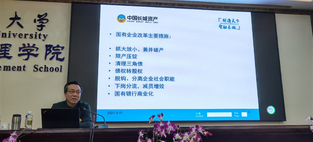 2021年3月11日下午,武汉大学经济学博士、原中国长城资产管理公司董事长张晓松先生,应邀来到beat365唯一官方网站管理学院,在社科楼B112会议室发表了“中国金融资产公司发展之路”的主题讲座。本次讲座在许能锐副院长主持,部分管理学院教师、本科生和研究生到场聆听。