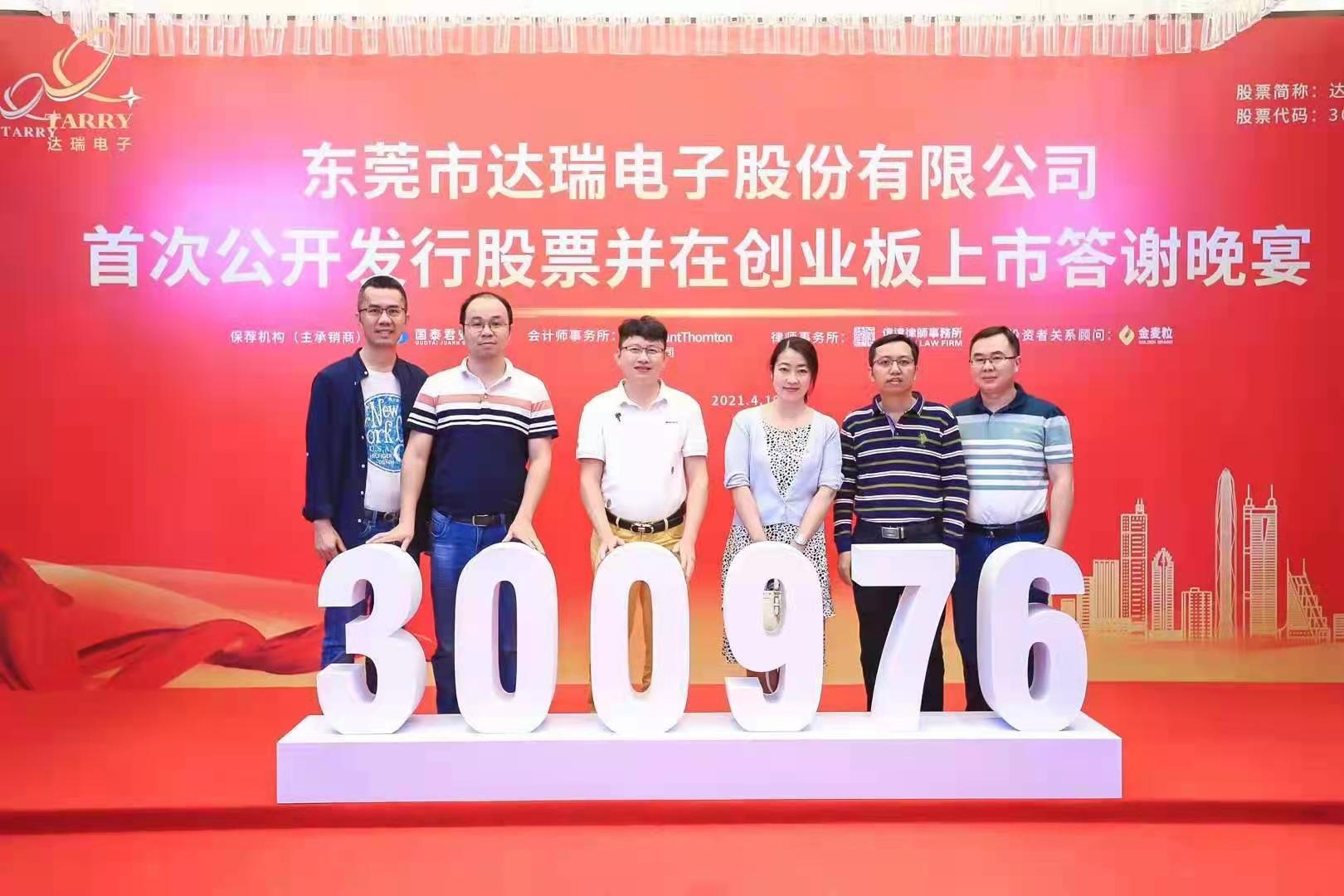 2021年4月21日,beat365官网99级校友李清平、邓瑞文创办的东莞市达瑞电子股份有限公司在深圳证券交易所创业板成功上市。达瑞电子以168元/股发行价格成为创业板最高发行价新股,募集资金总额达21.93亿元,成为东莞首发募集资金总额最高的企业,总市值现已突破百亿。