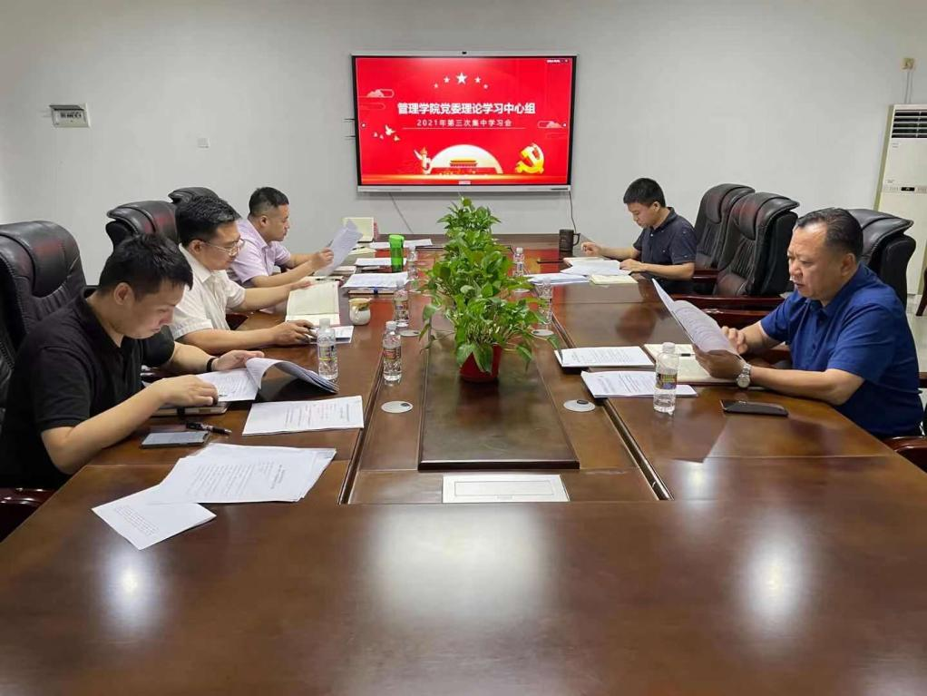 4月26日,管理学院党委理论学习中心组2021年第三次集中学习会在社科楼B314召开。会议由党委书记邢谷川主持,学院党委委员参加,院长唐宁玉列席。