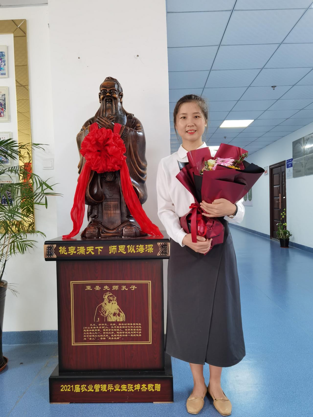 7月2日上午,管理学院2021届毕业生张坤杰捐赠仪式在社科楼B栋3楼召开。今年毕业的她用读研期间勤工俭学攒下的积蓄向学校捐赠了一座孔子雕像,表达7年来对母校培养和恩师教导的感激之情。