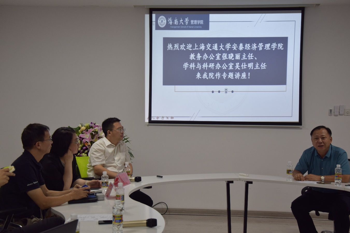 2021年7月12日上午,学院邀请上海交通大学安泰经济管理学院教务办公室张晓丽主任、学科与科研办公室吴仕明主任来beat365官网作专题讲座,学院全体党政班子领导、各系主任及副主任、各办(中心、项目、实验室)全体工作人员参会,本次讲座由许能锐副院长主持。