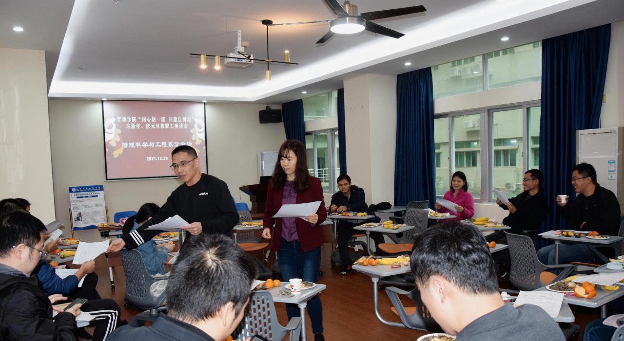 2021年12月28日下午,管理学院举行“同心创一流 共建自贸港”迎新年、庆元旦教职工座谈会。本次座谈会由学院工会组织承办,共分为五个分会场,包括工商管理系、会计系、农林经济管理系、管理科学与工程系以及综合管理分会场。全体教职工参加活动。