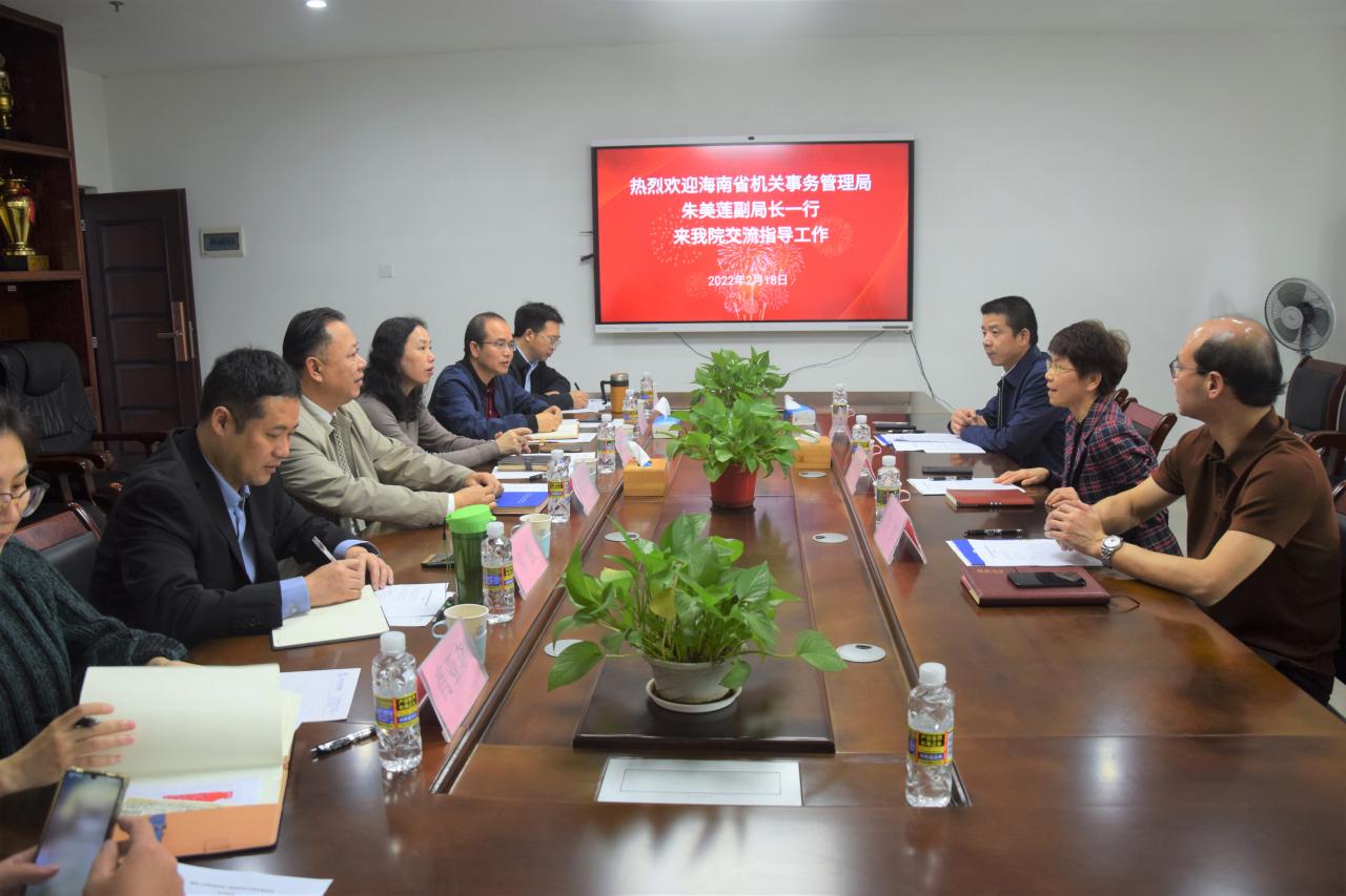 2022年2月18日下午,海南省机关事务管理局朱美莲副局长、许彤处长、黄贵强主任一行来beat365官网交流访问。beat365唯一官方网站管理学院院长唐宁玉、党委书记邢谷川、副院长张德生、副书记易振、副院长付景涛、副院长童泽林及学工办主任肖亚奇、辅导员李春出席会议。