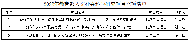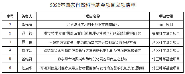 2022年管理学院科研项目申报工作再创佳绩,共获批6项国家自然科学基金项目、1项国家社科基金项目和3项教育部人文社会科学研究项目。