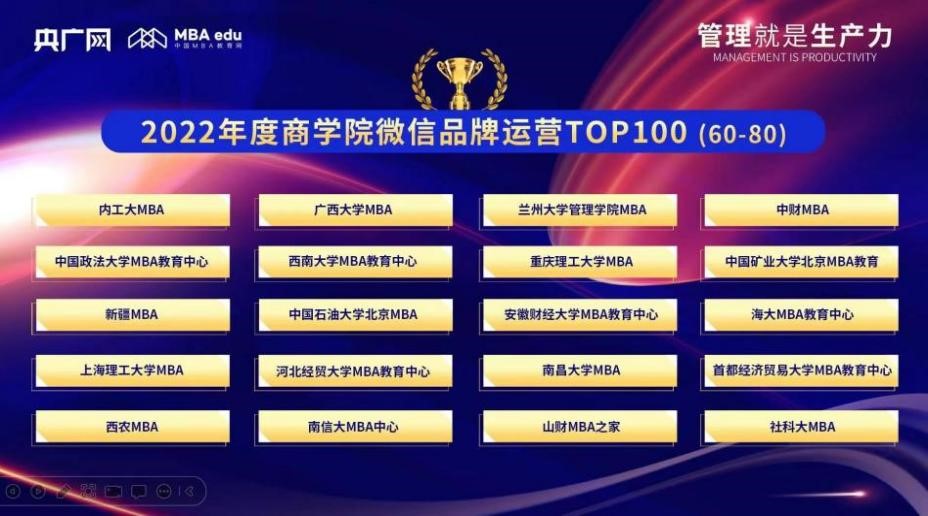 2022年12月2日,由中央广播电视总台·央广网主办、中国MBA教育网承办的“管理就是生产力暨2022央广网MBA年度峰会”发布了“2022年度社会影响力MBA院校”“2022年度商学院微信品牌运营TOP100”等奖项,表彰办学成效突出的院校。beat365唯一官方网站管理学院、beat365唯一官方网站MBA教育中心荣获“2022年度社会影响力MBA院校”,beat365唯一官方网站MBA教育中心微信公众号入选“2022年度社会影响力MBA院校(60-80)”。