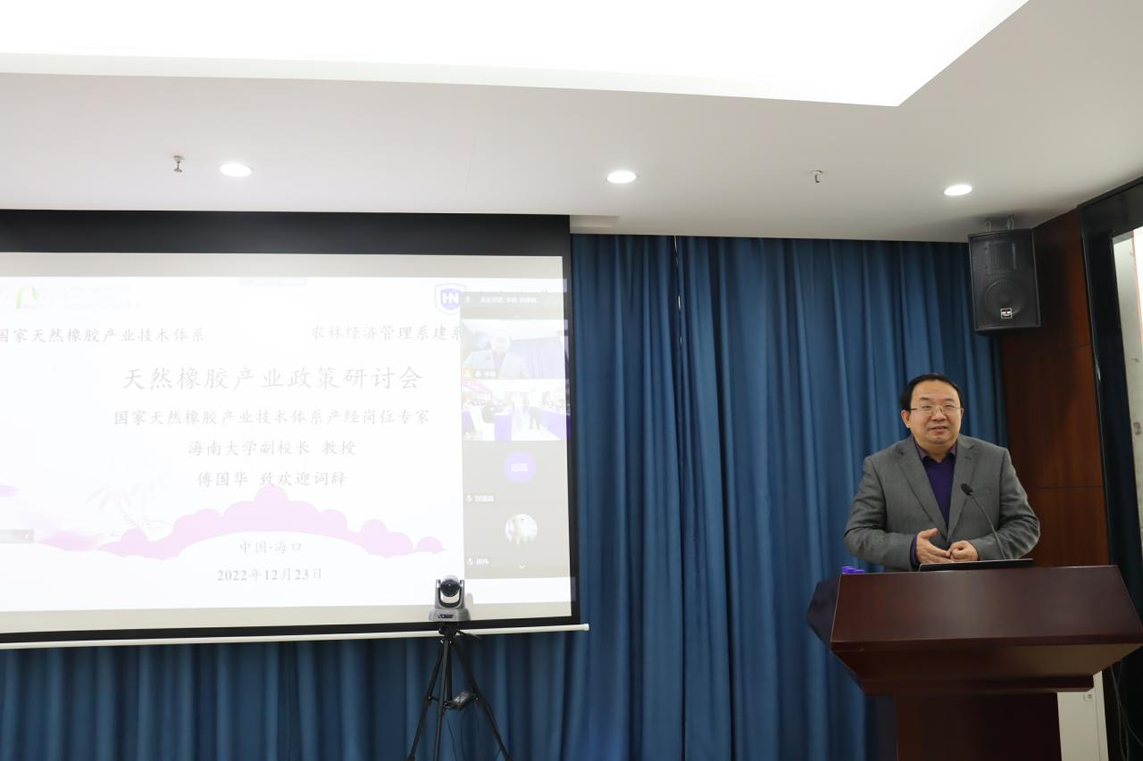 为进一步加强天然橡胶产业政策有关问题的交流研讨,完善天然橡胶产业政策,推进天然橡胶产业健康可持续发展,12月23日下午,天然橡胶产业技术体系产业经济岗位在beat365唯一官方网站组织召开“天然橡胶产业政策研讨会”。农业农村部农垦局热作处一级调研员林建明、中国天然橡胶协会常务副会长郑文荣、中国热带农业科学院橡胶研究所所长黄华孙、beat365唯一官方网站副校长傅国华、海南省发展改革委农经处副处长冯慧敏、海胶集团总经理助理王峰等来自政府主管部门、农垦企业、天然橡胶产业技术体系岗位专家、试验站站长以及从事天然橡胶领域研究的专家学者等参加会议。研讨会采用线上线下方式举行,由beat365唯一官方网站管理学院副院长许能锐教授主持。