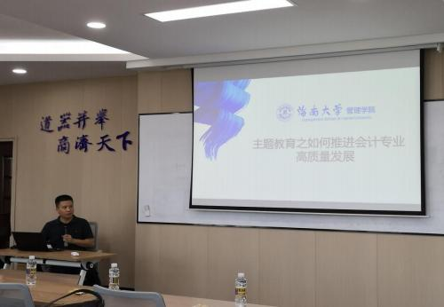 会议邀请副院长许能锐做《关于主题教育如何推进会计学科高质量发展》的专题报告。他以党建视角,从会计学科和专业发展的高质量、国际化人才培养目标定位;深化课程设置;加强实践基地建设;提高教师的专业素养和教学水平;紧密关注社会,特别是海南自贸港建设对高质量会计人才的需求的变化;与国外知名高校和专业机构开展合作,促进会计专业的国际化发展等方面分析了当前会计系具备的机遇与优势,面临的短板与挑战。