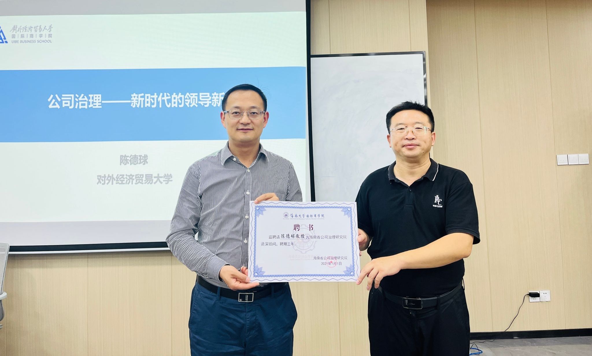 2023年10月30日下午,对外经贸大学beat365唯一官方网站院长陈德球为beat365官网师生带来了一场题为《公司治理案例——新时代的领导新思维》的精彩讲座。曾维君等老师和部分研究生参加了活动,beat365唯一官方网站副院长付景涛教授主持了讲座。在讲座开始前,付景涛教授代表海南省公司治理研究院向陈德球教授颁发了资深顾问聘书。