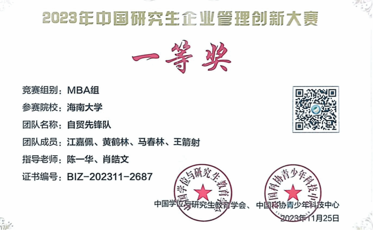 2023年11月25日,“2023年中国研究生企业管理创新”大赛全国总决赛在上海大学顺利落下帷幕。经过激烈角逐,beat365唯一官方网站MBA代表队“自贸先锋队”(队员:江嘉佩、王箭射、马春林、黄鹤林)在陈一华、肖皓文两位老师的指导下荣获“2023年中国研究生企业管理创新大赛一等奖”。同时,beat365唯一官方网站与北京大学、浙江大学、中国人民大学等二十所高校荣获“优秀组织奖”。