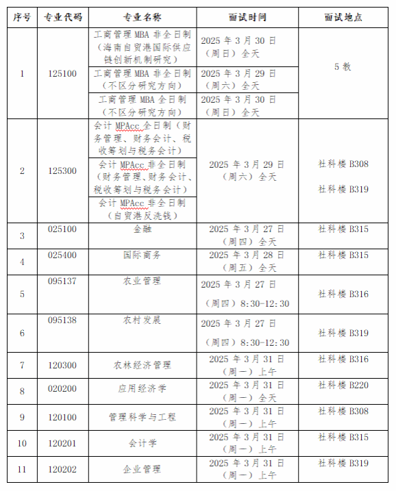 说明:1.以上招生计划和复试人数均不含专项计划。2.应用经济学、管理科学与工程、会计学、会计、会计( 自贸港反洗钱)等5个专业初试合格生源不足120%,按照学校相关规定,所有满足2025年相应学科国家线(B类考生)的考生都可参加复试。3.复试人数计算方法为:(招生计划人数-已录推免生人数)×复试比例。