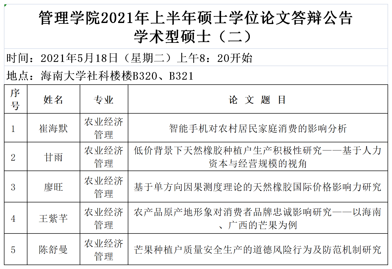 管理学院2021年上半年硕士学位论文答辩公告—学术型硕士(二)