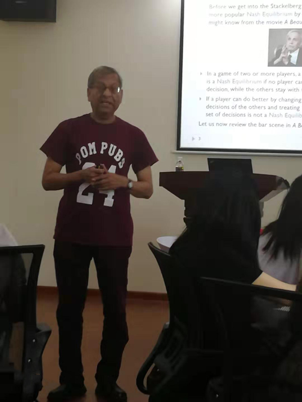 Suresh P. Sethi教授为了便于师生们理解所讲的主题,开头通过短小电影片段和诙谐幽默的谈吐,介绍了纳什均衡的概念,进而介绍斯塔克伯格博弈的基本应用。然后Suresh P. Sethi教授向师生展示了自己团队发表在著名期刊上的论文,通过讲述简单的单周期斯塔克伯格的成本利润分析,引入时间变量,深刻阐释了两周期博弈双方的动态分析,最后将公式推广到多周期的博弈循环。在场师生们结合自身研究工作进行了提问与交流,现场学术氛围浓厚,与会师生都表示受益匪浅。