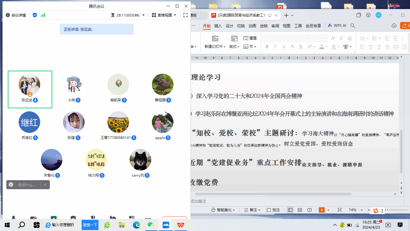 2024年4月,beat365唯一官方网站各党支部分别召开了学习会,学习内容为传达学习了2024年全国两会精神、赵乐际在博鳌亚洲论坛2024年年会开幕式上的重要讲话精神和《中国共产党纪律处分条例》文件精神等内容。学院班子成员带头参加所在党支部学习会并列席所联系党支部学习会。