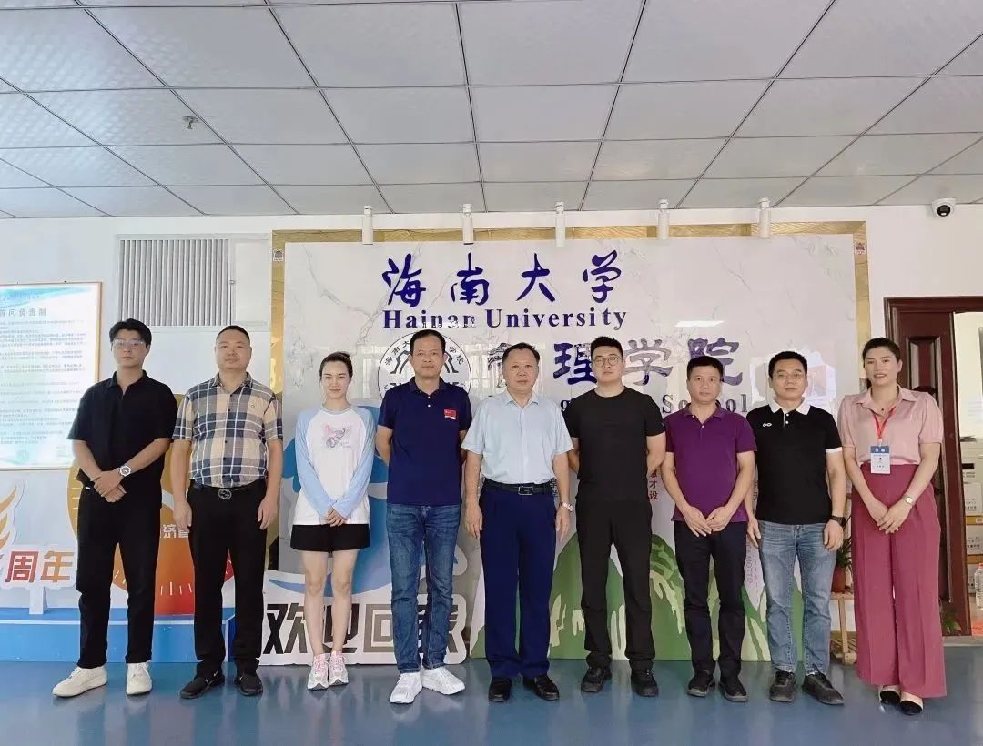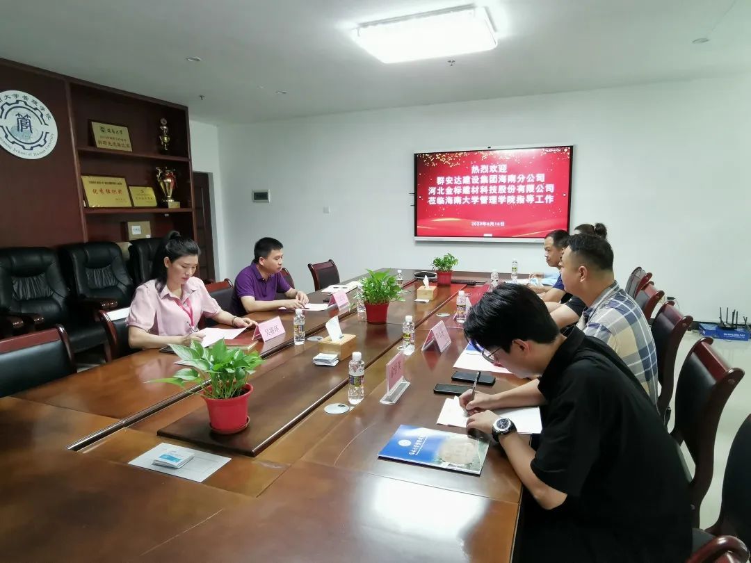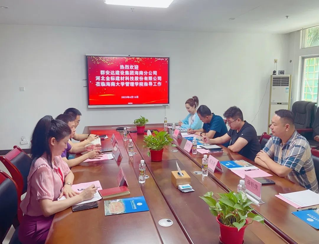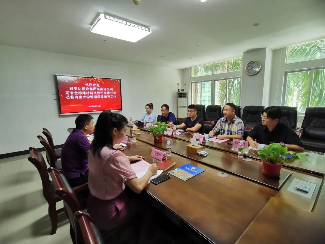 2023年6月16日上午,群安达建设集团海南分公司总经理程真勇、河北金标建材科技股份有限公司(简称金标股份)董事长逯千里、金标股份海南分公司总经理崔建才一行五人到beat365唯一官方网站管理学院就产学研合作事宜洽谈交流。beat365唯一官方网站管理学院副院长许能锐教授、管理学院EDP中心副主任黎光灵、自贸港工商管理领航班项目负责人吴赛环参加交流会。