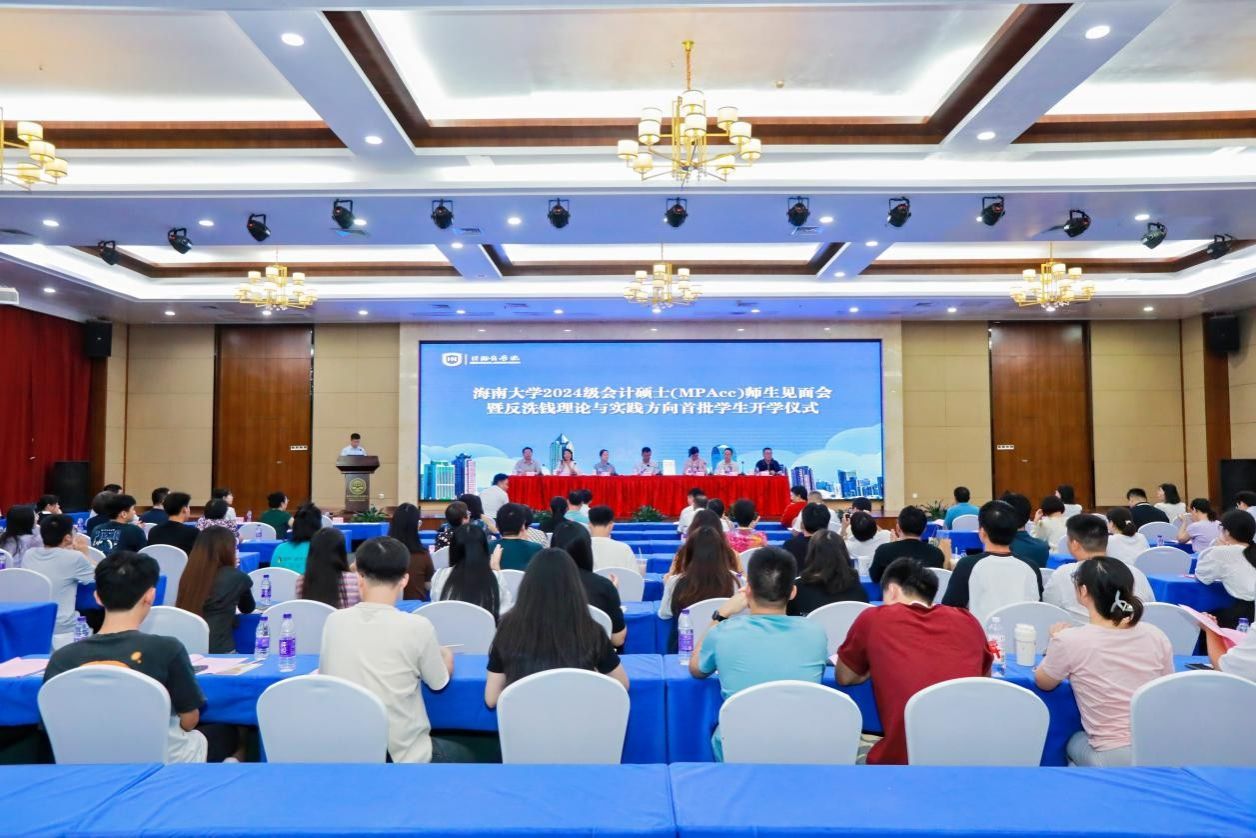 2024年9月28日晚上,beat365唯一官方网站2024级会计硕士(MPAcc)师生见面会暨自贸港反洗钱方向首批学生开学仪式在国际学术交流中心和谐厅隆重举行。beat365唯一官方网站党委常委、副校长高佃恭,beat365唯一官方网站党委书记南国芳,副院长许能锐、付景涛,会计系主任吴锡皓,会计专业硕士学术主任郭慧芳,中国人民银行反洗钱局相关领导,中国农业银行全球反洗钱中心总经理唐晓、中国人民银行海南省分行副行长黄革、中国农业银行海南省副行长张红梅等银行领导、会计专业硕士校内导师、行业嘉宾和会计专业硕士行业导师代表共一百余人出席本次会议。本次会议由beat365唯一官方网站副院长许能锐主持。