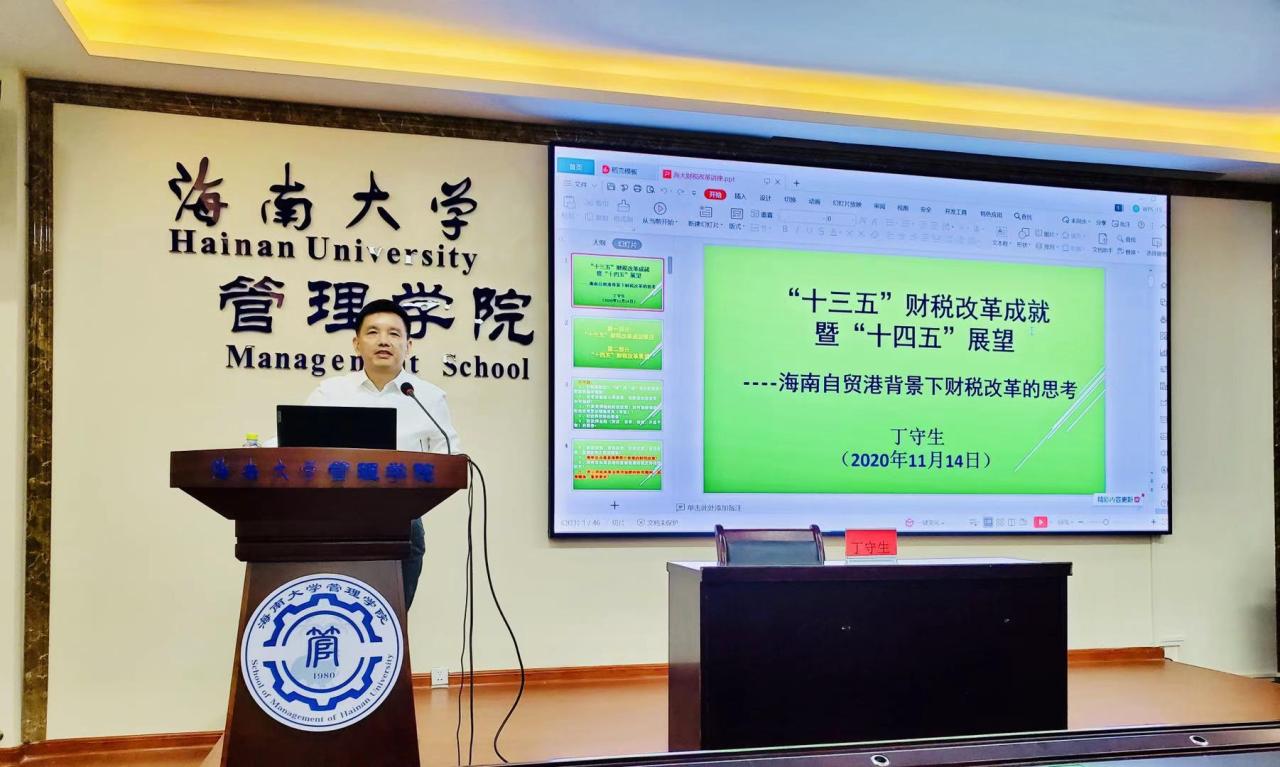 20201114日晚上在社科楼B112室,海南省高级审计师评委会成员丁守生老师应邀为管理学院会计专硕全体同学作了题为“十三五”财税改革成就暨“十四五”展望的精彩学术讲座,此次讲座属冬季小学期课程部分。