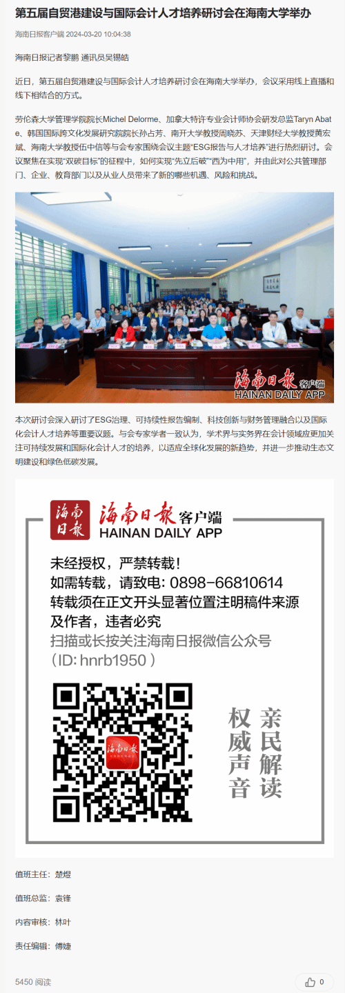 《海南日报》以“第五届自贸港建设与国际会计人才培养研讨会在beat365唯一官方网站举办”为题,重点阐述了参与专家、研讨议题、会议主题与目标。此篇文章到本文发文前阅读量达5000+。