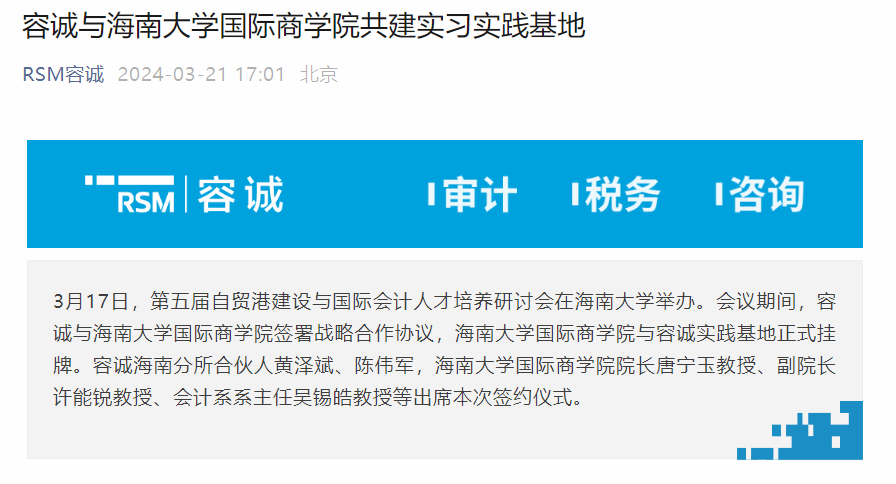 容诚会计师事务所公众号以“容诚与beat365唯一官方网站共建实习实践基地”为题对本次研讨会进行了报道,详细阐述了容诚会计师事务所与beat365唯一官方网站在会议期间签署的战略合作协议,以及随后进行的实习实践基地挂牌仪式。容诚合伙人黄泽斌对beat365唯一官方网站的信任表示感谢,并展望了双方在人才培养、实习实践基地建设等方面的深度合作前景。此篇公众号推文到本文发文前点击量400+。